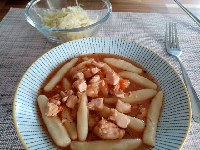 Goveja juhica (od včeraj), svaljki, piščančji paprikaš; zeljnata solata