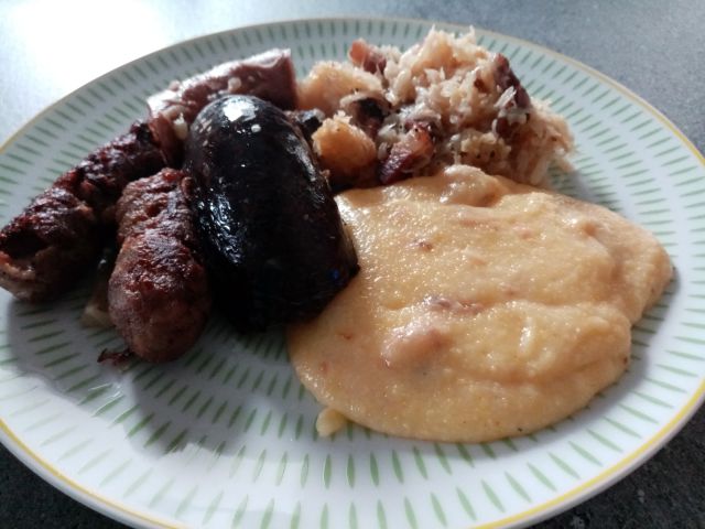 Podvarak, polenta z ocvirki in suhimi paradižniki, pečenica in krvavica