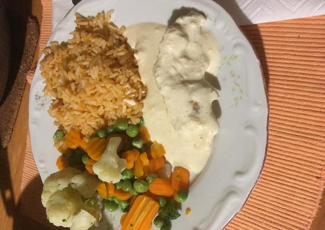 Pri nas danes za kosilo zrezki v smetanovi omaki, riz, kuhana zelenjava, solata in za posladek marmorni kolac.