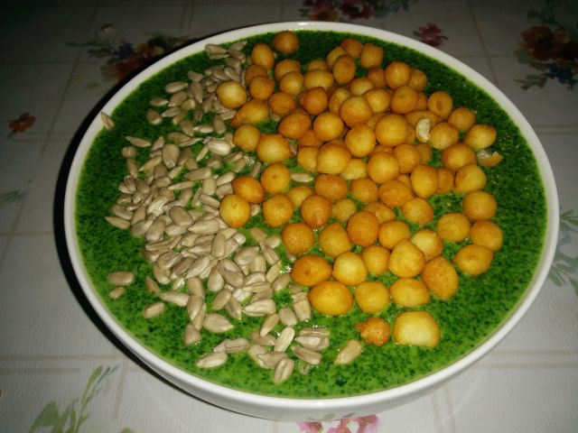 zraven pa sem pojedla še par kolobarjev klobase, ki so jo ostali jedli z jedjo, ki ni ne fižolova juha, ne pasulj, pač taščina "spretnost" kuhanja. Spila sem limonado (pomaga bi prenosu železa iz blitve v telo) ter blitvo posula s sončničnimi semeni, ker pomaga kot dodatek kalcija, katerega blitva (in špinača) odvzemata telesu. No, pa še malo hrustljavih kroglic ![]()