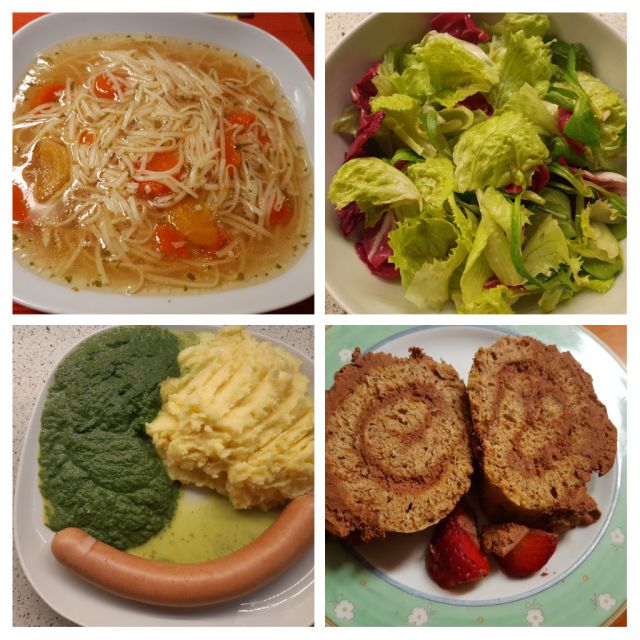 Danes goveja juha z rezanci, špinača, pire krompir, hrenovke, solata, rolada.