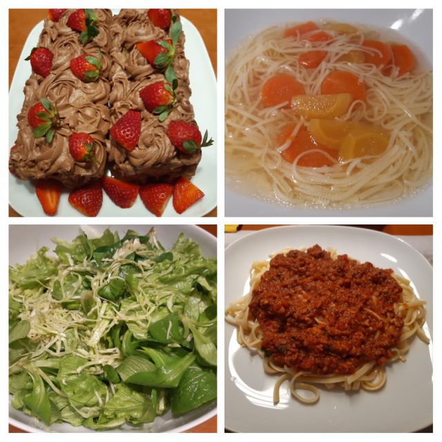 Včeraj goveja juha, testenine bolognese, zame file ribe, mešana solata, čokoladna rolada.