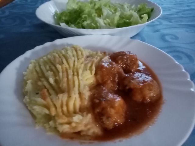 Čuftice v omaki, pire krompir, zelena solata