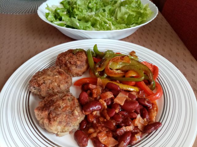 Mesni popečki, tris paprik v voku, zapečen fižol, zelena solata; skutne pogačice