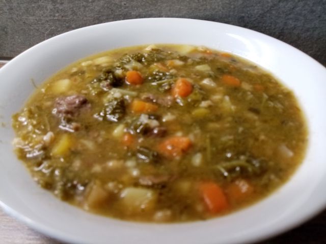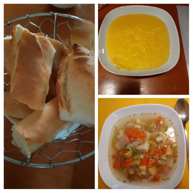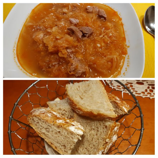 Goveja juhica; rusko zelje s kračo, krompirjevi žganci, krvavice, bagete, skutni zvitki; pecivo