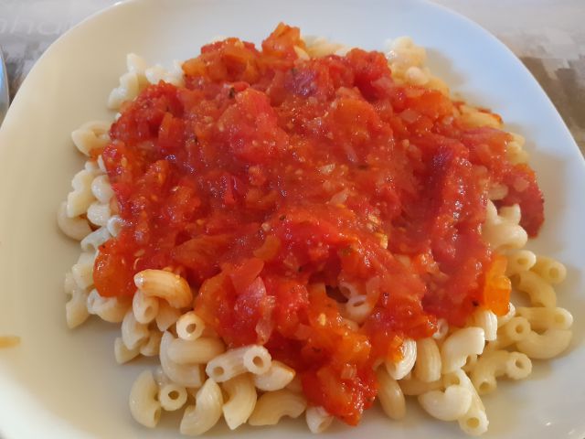 Danes goveja juha z rezanci, paradižnikova omaka, testenine, zelena solata
