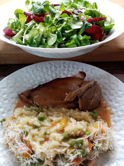 Zelenjavna rižota, popečen telečji zrezek z omako; motovilec, črna redkev, fižol