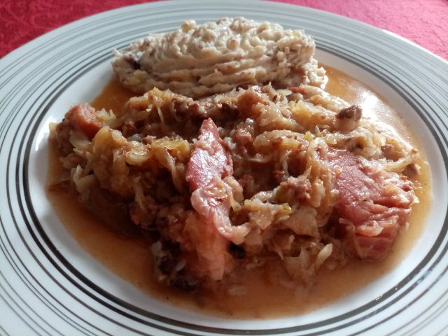tenstane krpice sladkega zelja s polžki in narezano pečenico na koščke, samostojna jed. Zraven paše še kozarec pijače po želji, nasitno