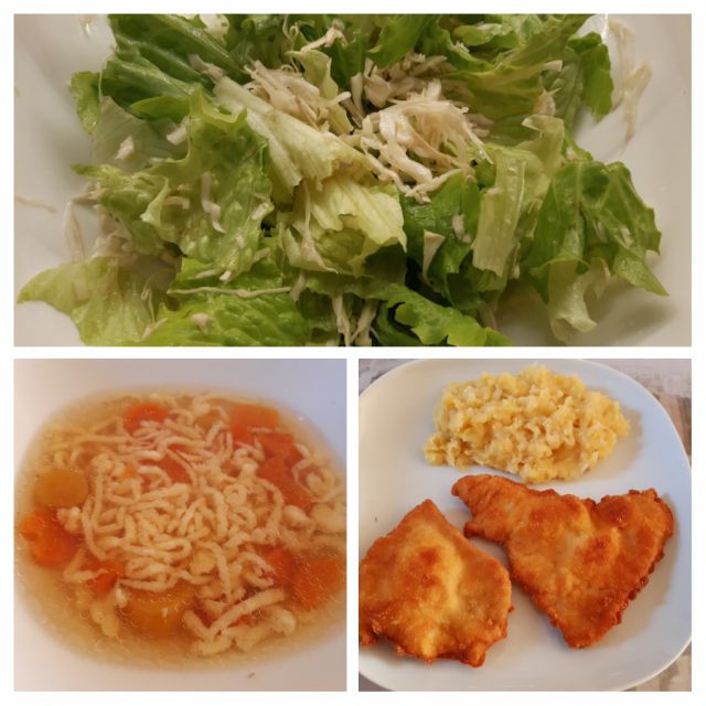 Danes goveja juha z vlivanci, pražen krompir, meso po dunajsko ( zame pečeno), solata