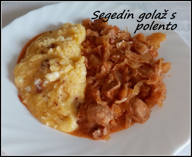 Segedin golaž, polenta s sirom in ocvirki