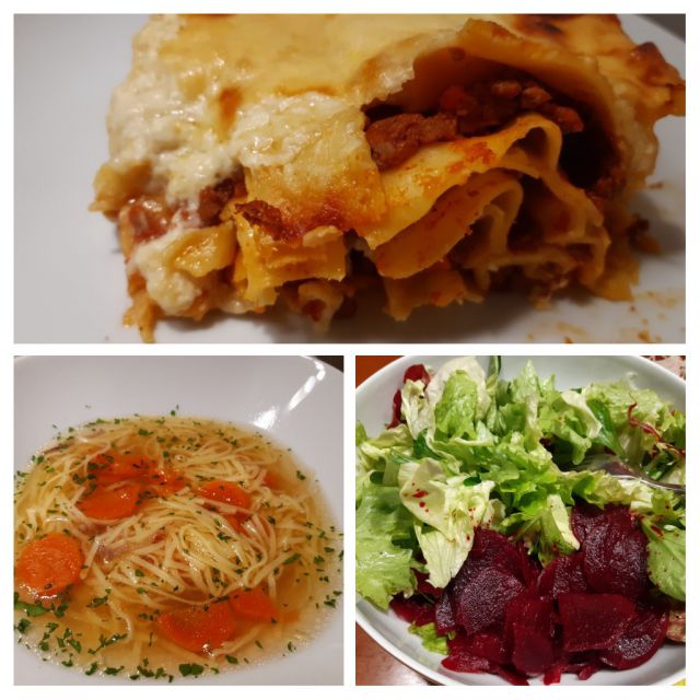 Goveja juha z rezanci, lazanja, solata z domačo rdečo peso