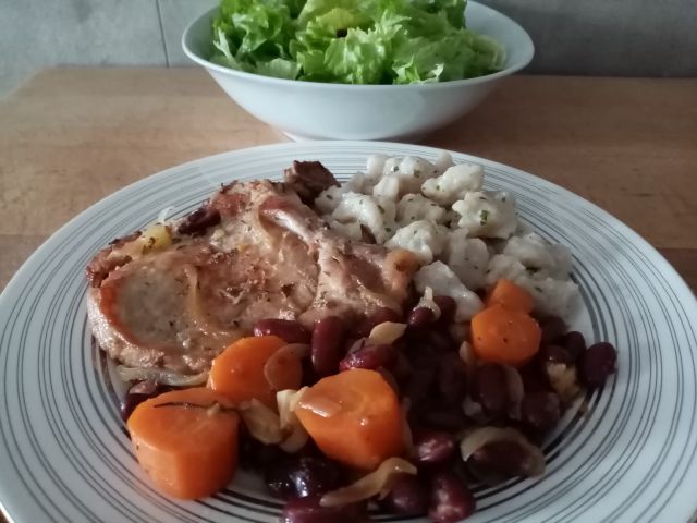 Kotlet v čebuli, zelenjavi in vinu; ščipanci; zelena solata