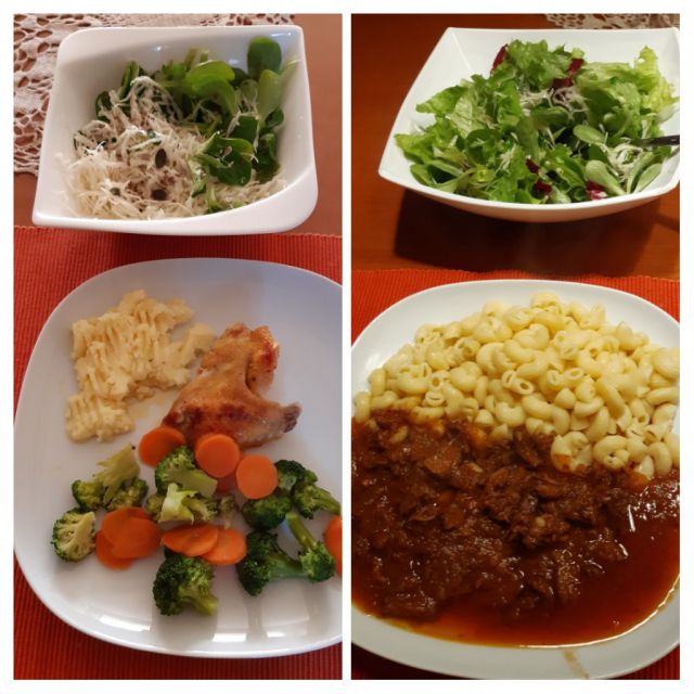 Včeraj telečji golaž, polžki, zame perutka, zelenjava, krompir, solata