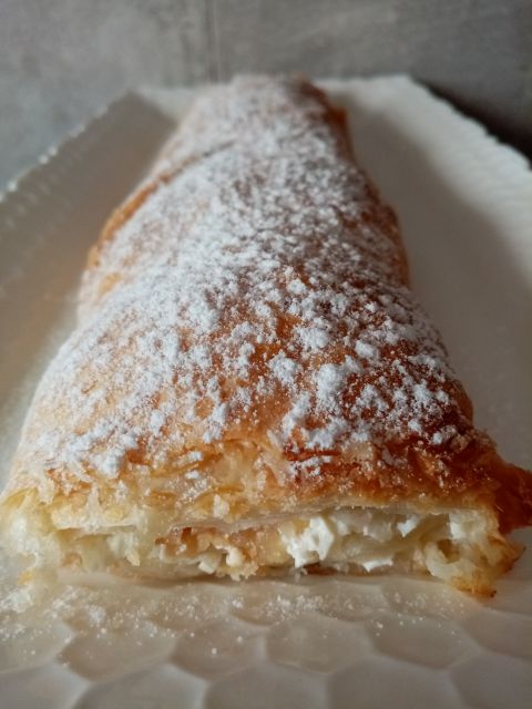 Kisla enolončnica z jurčki; skutno-jabolčni zavitek
