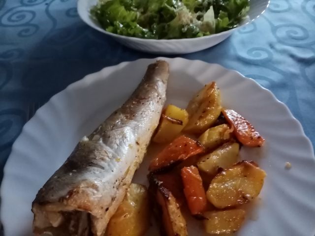 Oslič s krompirjem iz pečice; zelena solata z zeljem