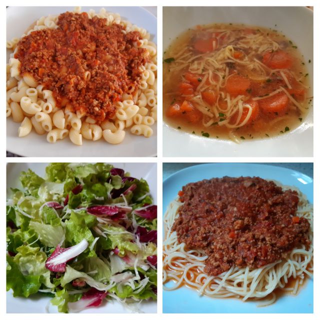 Goveja juha z rezanci, bolognese omaka, testenine, solata