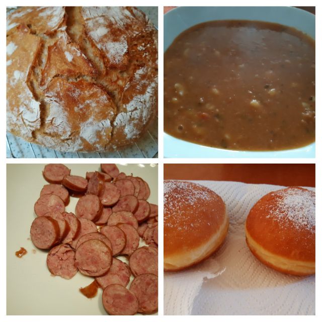 Fižolova juha, kranjska klobasa, domač kruh, prvi letošnji domači krofi...