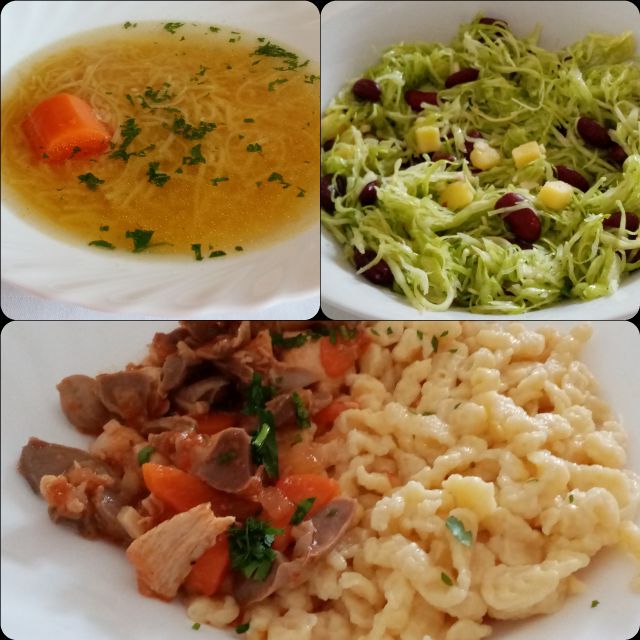 Piščančja juhica; piščančji paprikaš, špecli; zeljnata solata s krompirjem in fižolom
