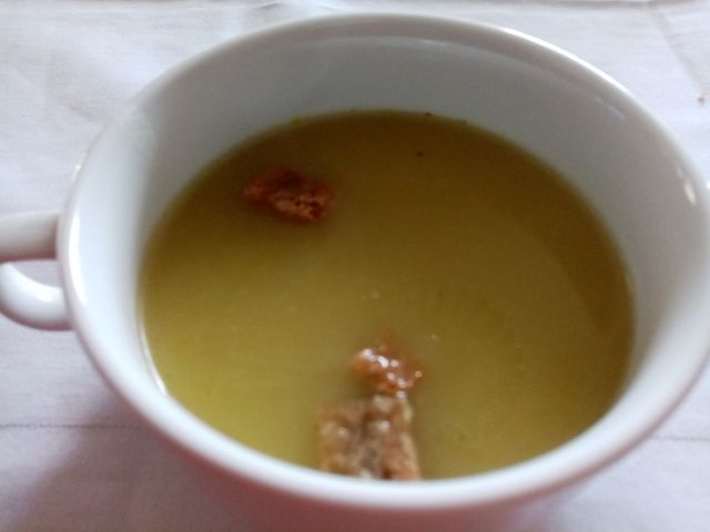 Kremna juhica, panirana nadevana paprika, mešana solata