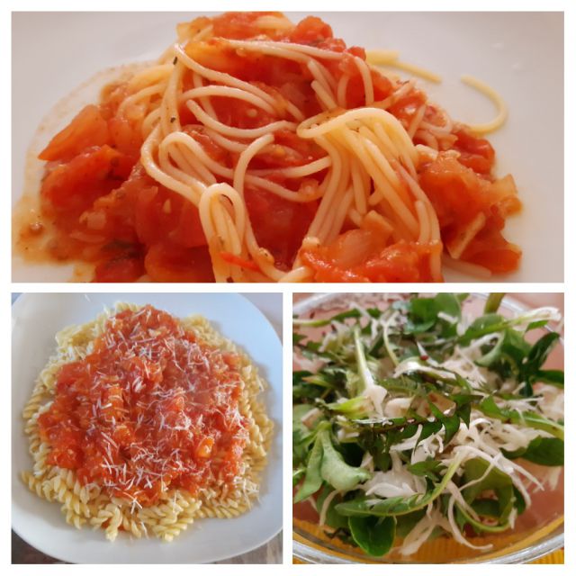 Danes paradižnikova omaka, testenine, solata