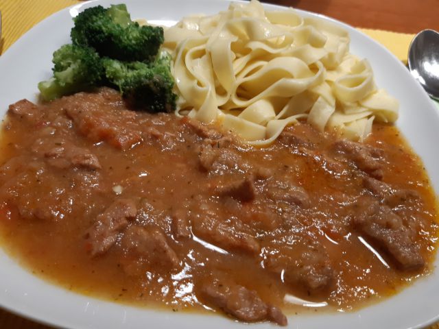 Danes telečji golaž, široki rezanci, brokoli, solata