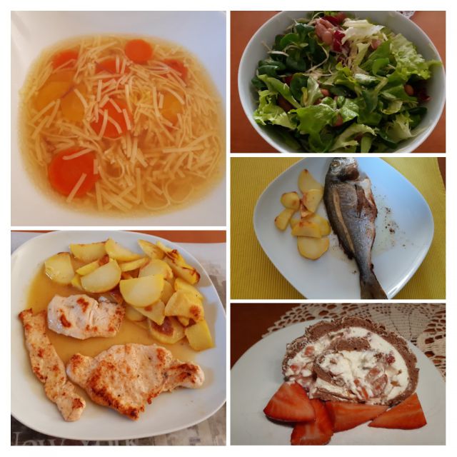 Danes goveja juha z rezanci, pečeni mesni fileji, orada, pečen krompir, solata, čokoladna beljakova rolada z jagodami