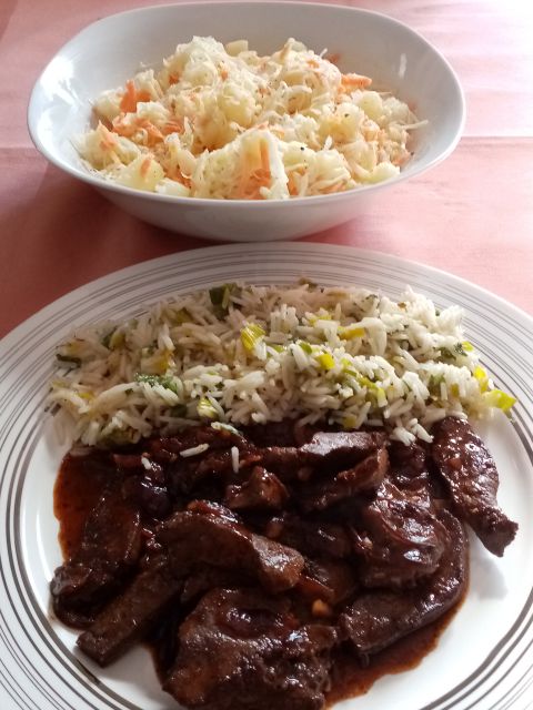 Pražena jetrca, basmati riž na poru; solata = zelje, korenček, črna redkev