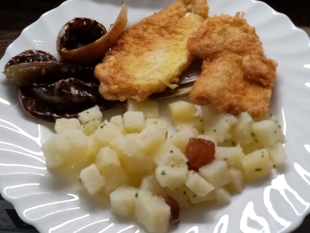 Kisla juha (piščančji hrbet), zabeljen krompir, piščančje po pariško, dušen radič
