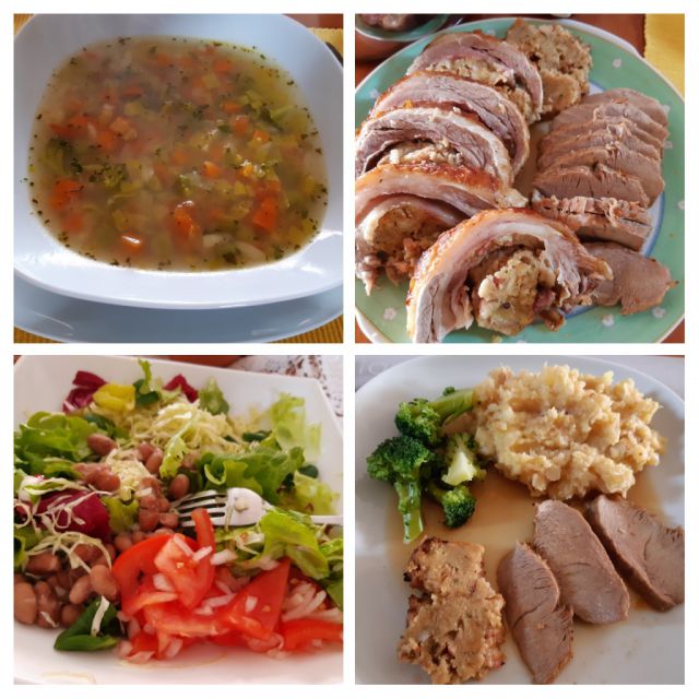 Včeraj zelenjavna juha, filana telečja prsa, telečji file, pražen krompir, mešana solata, rolada