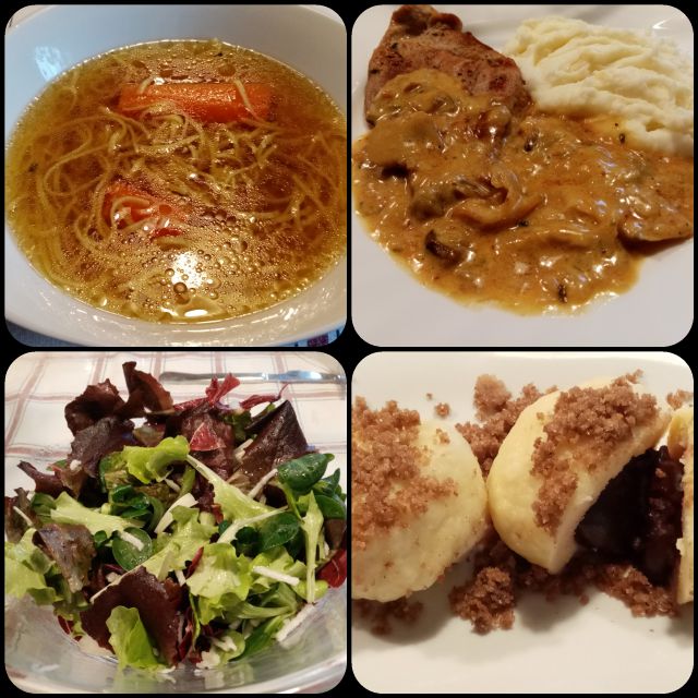 Goveja juha z štruklji z nadevom iz ajdove kaše (porabila ajdovo rižoto od včeraj), govedina, pražen krompir, solata s fižolom, krhki flancati, kava