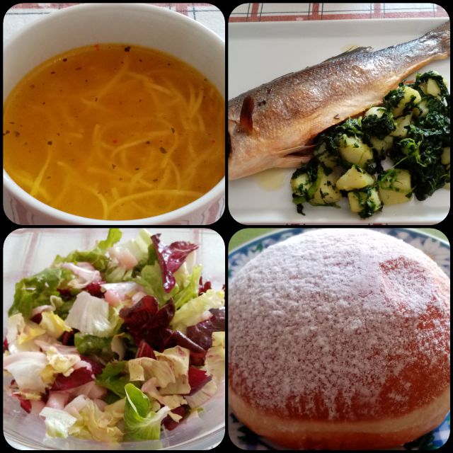 Goveja juhica, pečen brancin, krompir s špinačo, endivija z radičem; krof (kupljen)