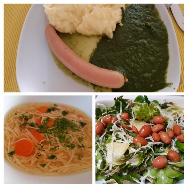 Včeraj goveja juha z rezanci, špinača, pire krompir, hrenovka, solata