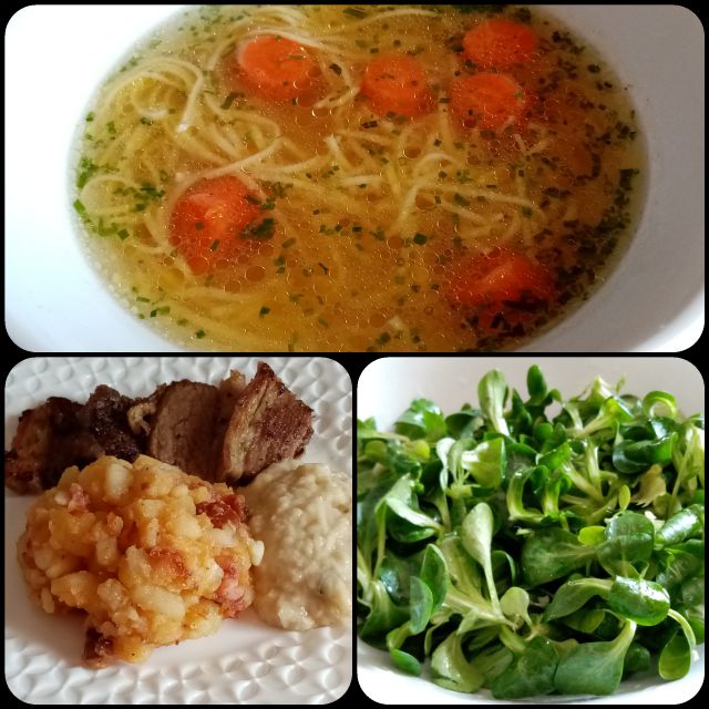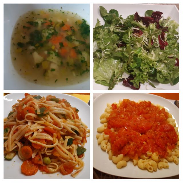 Danes zelenjavna juha s pirinim zdrobom, bavette z zelenjavno omako, polžki s paradižnikovo omako, solata