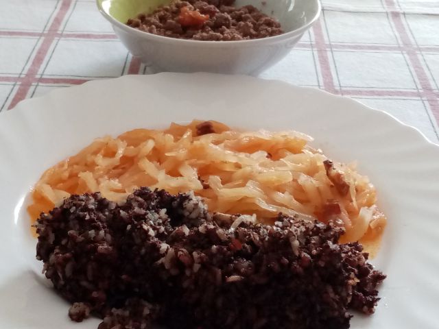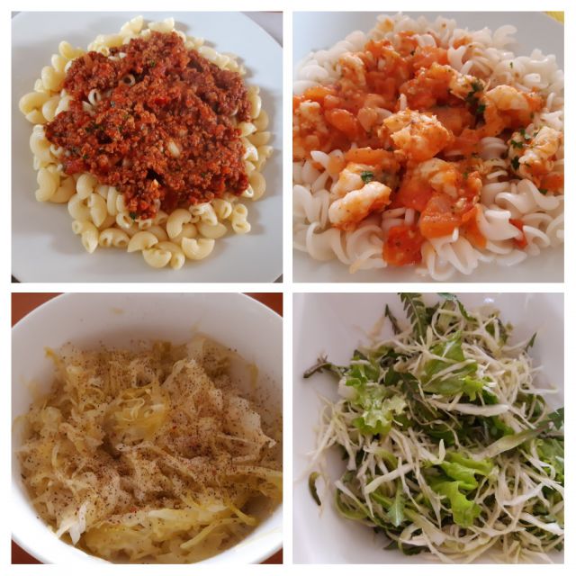 Danes polžki z mesno omako in riževi fussili z gamberi v paradižnikovi omaki. Za moža kislo zelje v solati, za naju mešana solata.