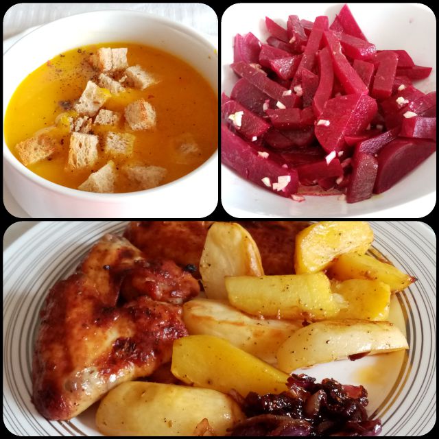 Bučna juhica s popečenimi kruhki; pečene perutničke s krompirjem, čebulni čatni; rdeča pesa