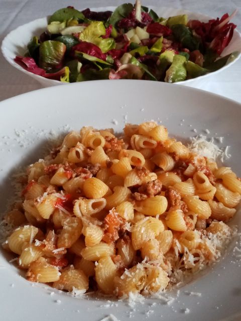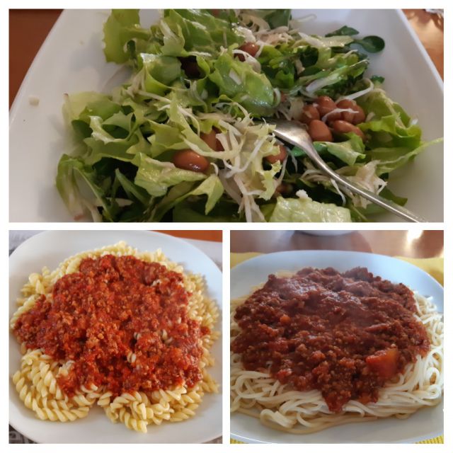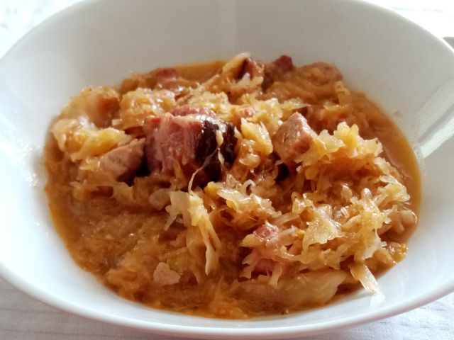 Makaronflajš, radič s krompirjem in popečeno slanino