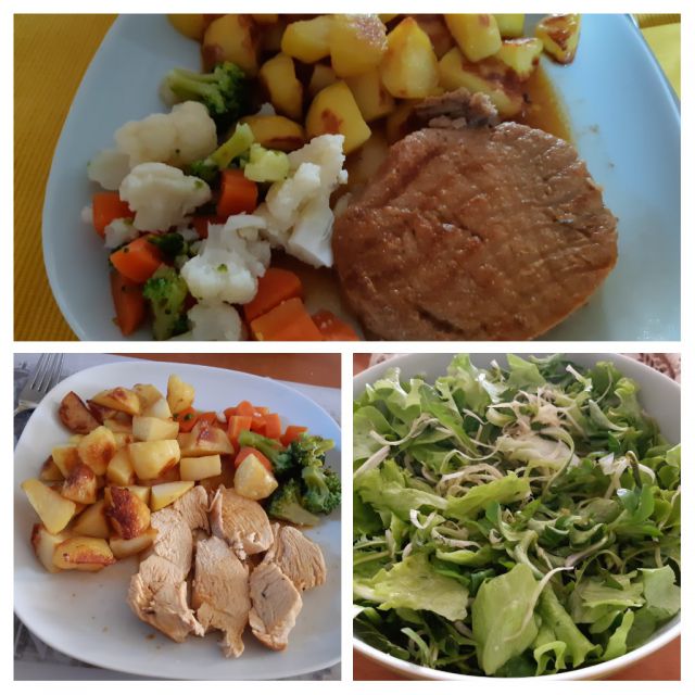 Tudi jaz sem danes vrtičkala, zato kosilo iz pečice- piščančja prsa, sv.kotlet, pečen krompir, zelenjava,