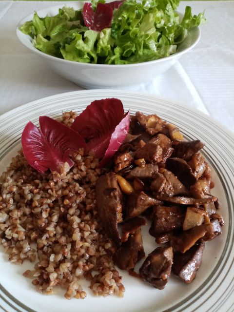Piščančji želodčki, jetrca s čebulo in jurčki, ajdova kaša na ocvirkih; zelena solata