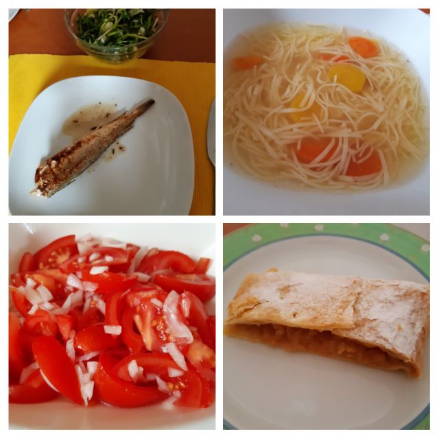 Danes goveja juha z rezanci, za fanta lazanja od včeraj( ni slikice) paradižnikova solata, zame pečen oslič, zame regrat s krompirjem.Jabolčni zavitek.