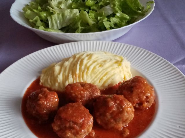 Juhica (dušena gomoljna zelena, ribana kaša); čuftice v paradižnikovi omaki, pire krompir; zelena solata; pravkar pečen hlebec kruha