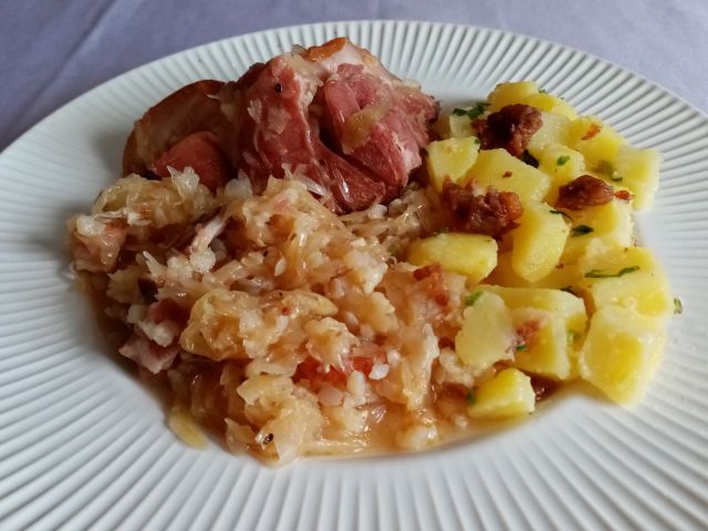 Podvarak s suho kračo, krompir zabeljen z ocvirki; jabolčna pita; kruh s semeni in ocvirki