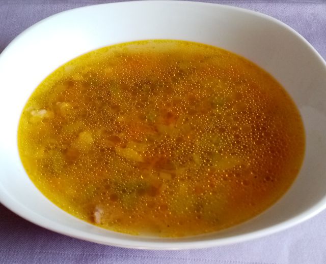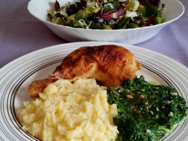 Kostna juha z naribanim korenčkom, zeleno in porom; nadevano piščančje bedro, pire krompir/zelena, špinača; radič z zeljem in krompirjem