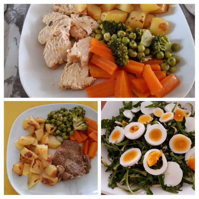 Danes pečena piščančja prsa, telečji kare, pečeno korenje,pečen krompir, dušen grah in brokoli, danes nabran regrat z jajci