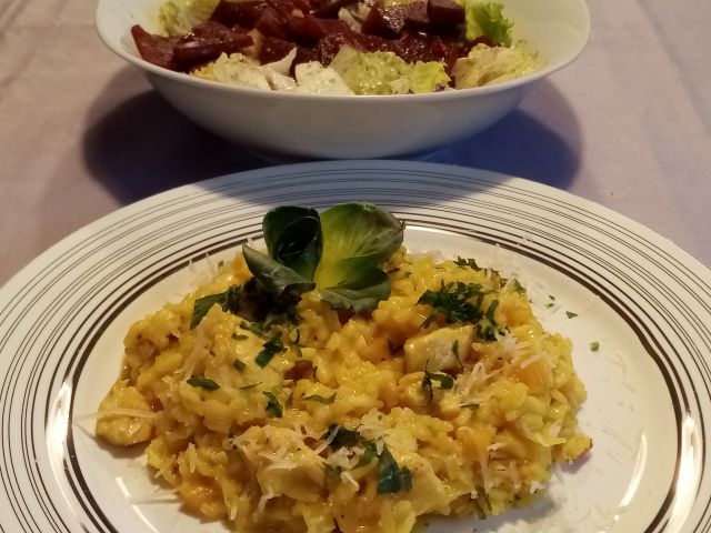 Piščančje-porova rižota, zelena solata z rdečo peso