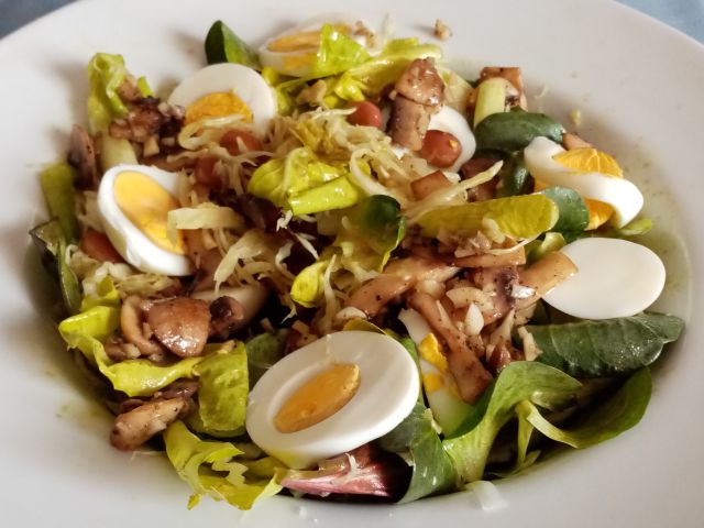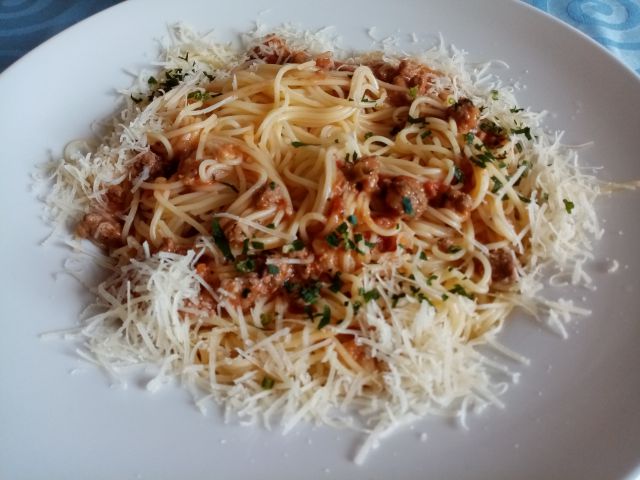 Špageti bolognese; mešana solata (radič, zelje, fižol, šampinjoni, jajca)