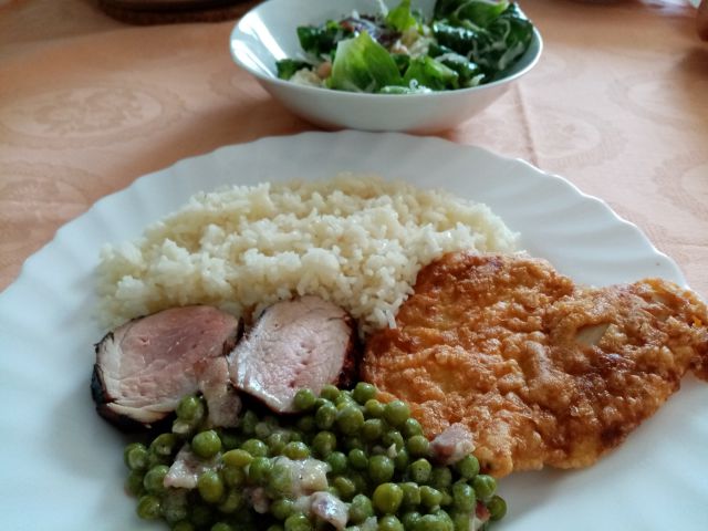 Goveja juhica, basmati riž, grah v omaki, piščančji file po pariško, sv. ribica; mešana solata; skutno-jabolčna pita