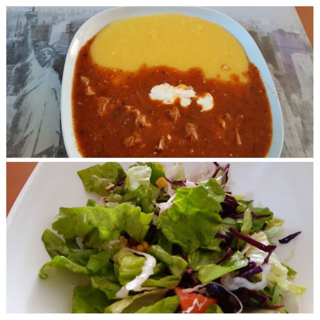 Nedelja: zelenjavna juha, pohana piščančja stegna brezbkosti, pečen krompir, solata, rozinova potica, kava