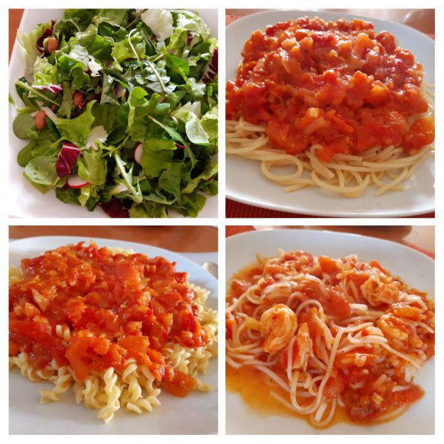 Včeraj paradižnikova omaka s testeninami ( eden svedrčke, drugi špagete), jaz riževe rezance z dodatki gamberov, solata