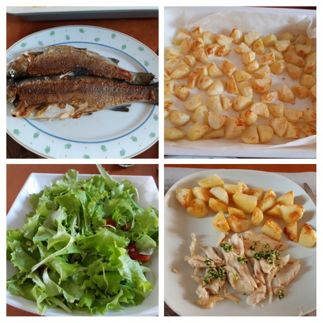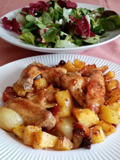 Krompir in perutničke iz pečice; radič, mlada čebula in fižol