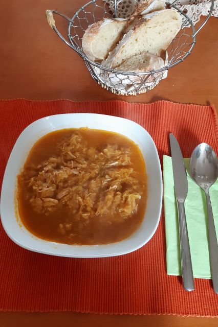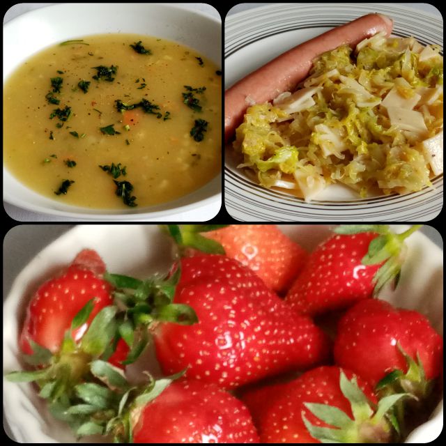 Česnova juhica; krpice z zeljem, hrenovka; jagode; pravkar pečen hlebec